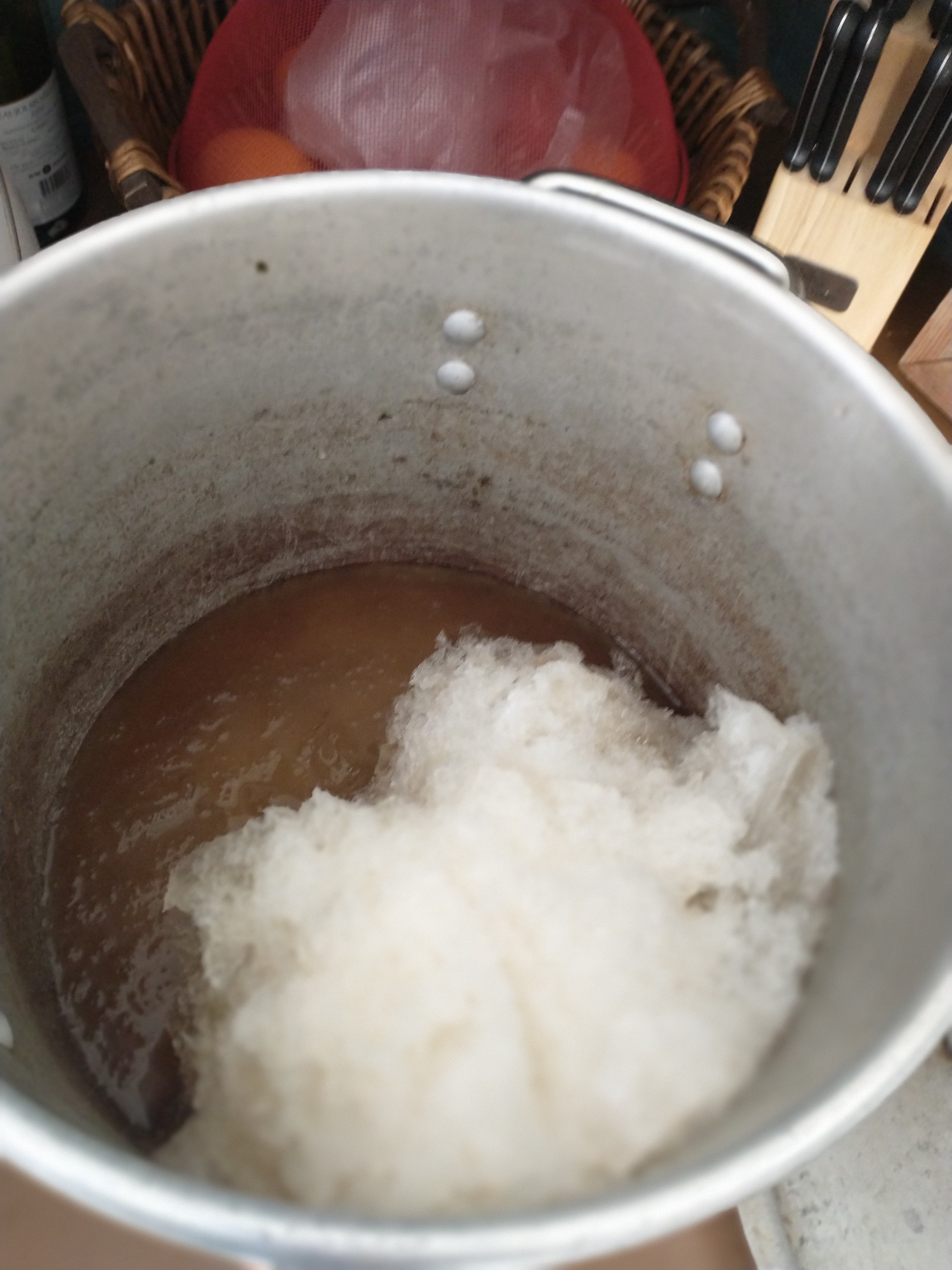 This morning I brought it in. There was a thick slush in the bucket. I scooped it out with a slotted spoon, and then bottled what remained; about 3 liters of applejack.