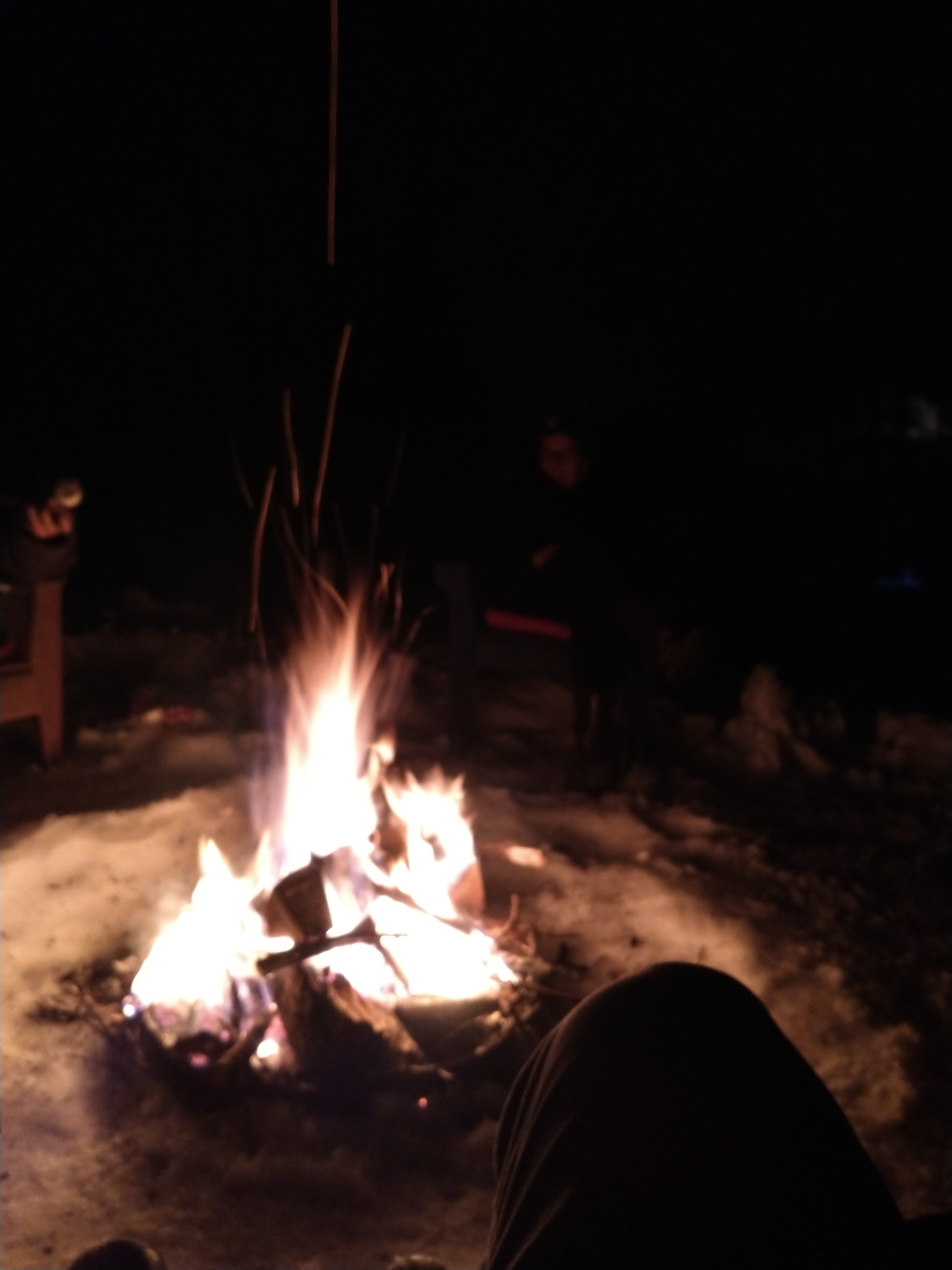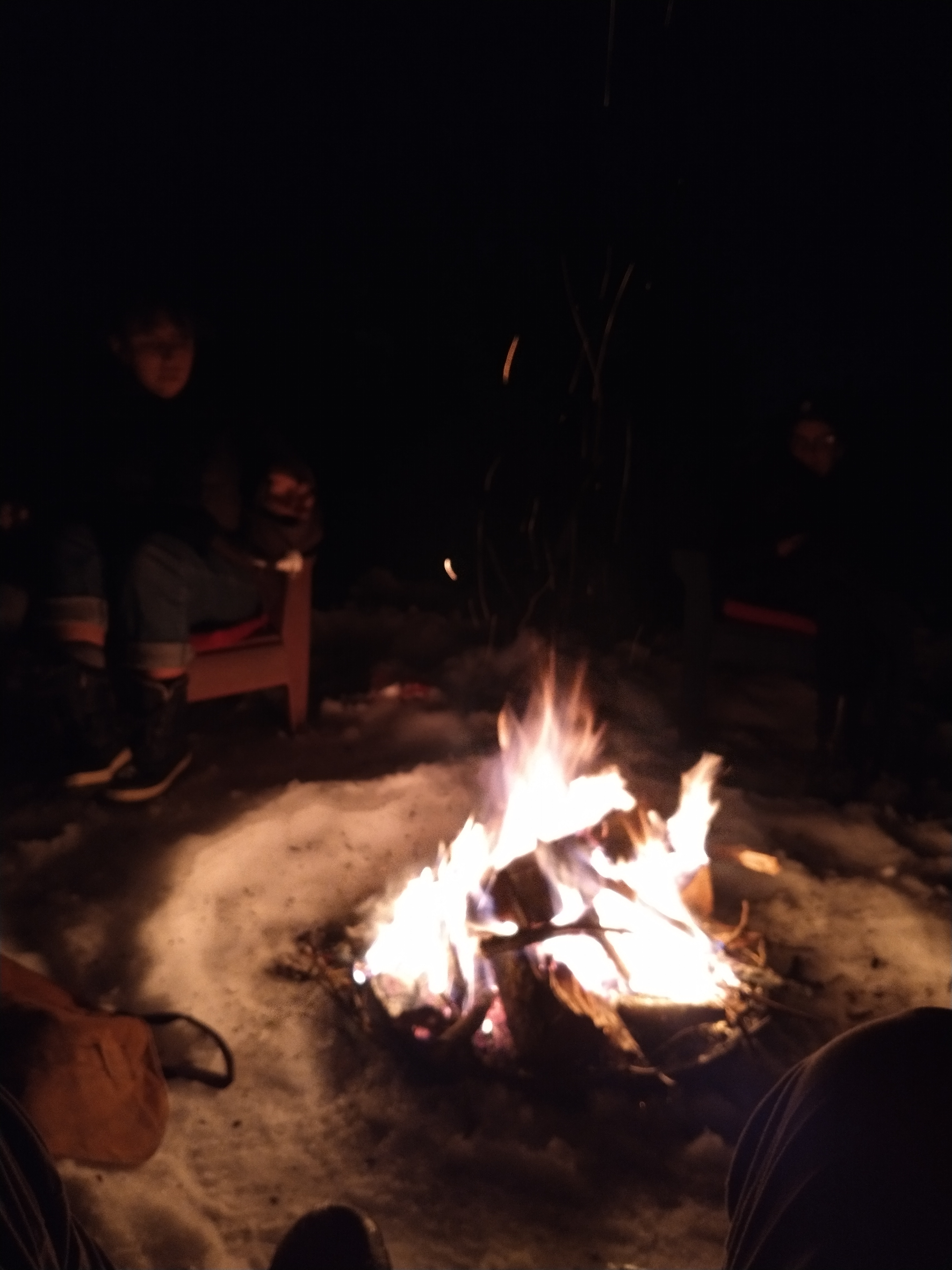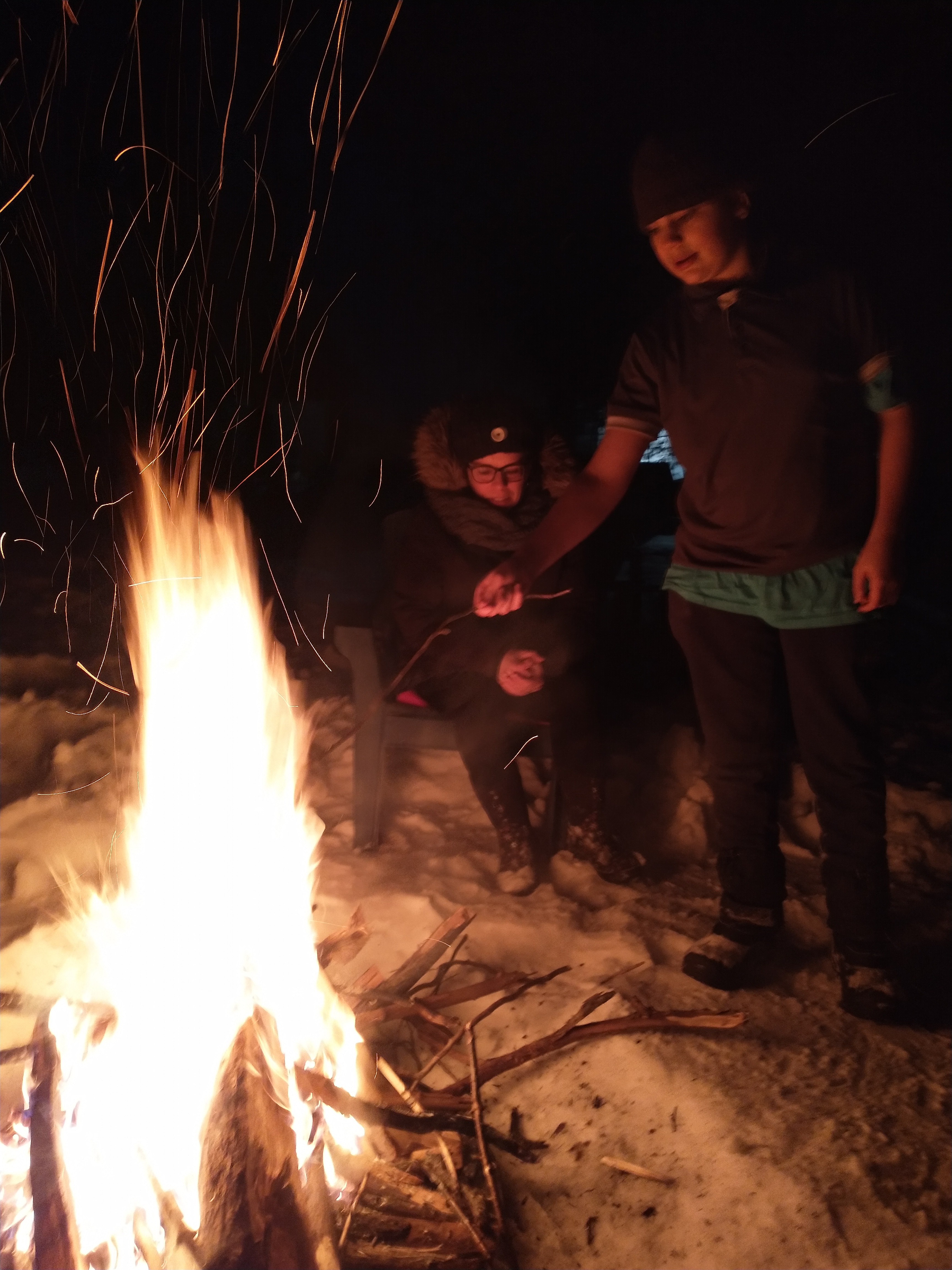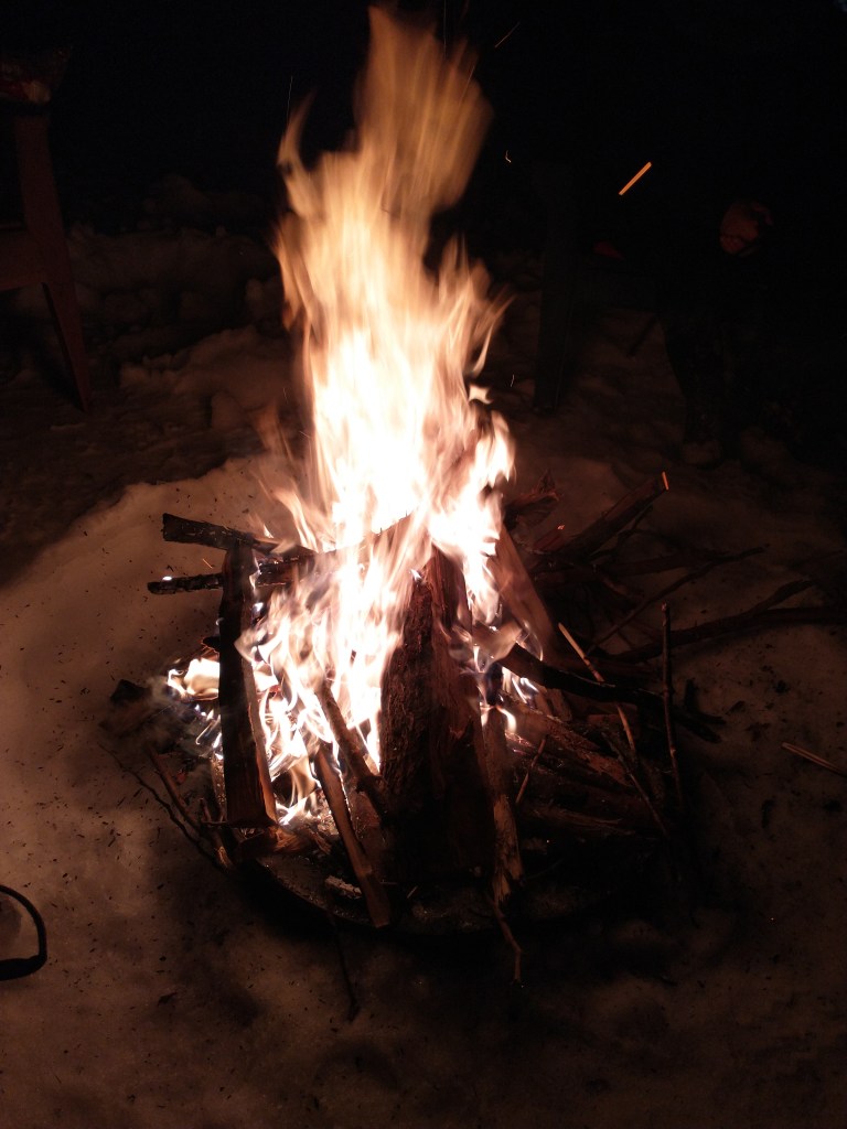 We made a bonfire in the backyard in the country. I had to dig down half a meter through the snow to get to the firepit, and the firewood pile was rimed with ice, but once I got it started with dry fireplace wood, everything went up really well.