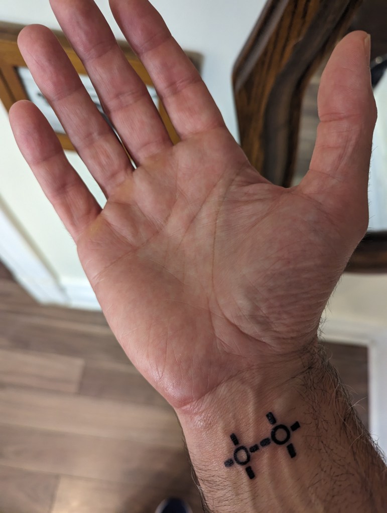 To celebrate, I got a tattoo on my wrist of the symbol for 2 myriad from the Aegean numbers system.